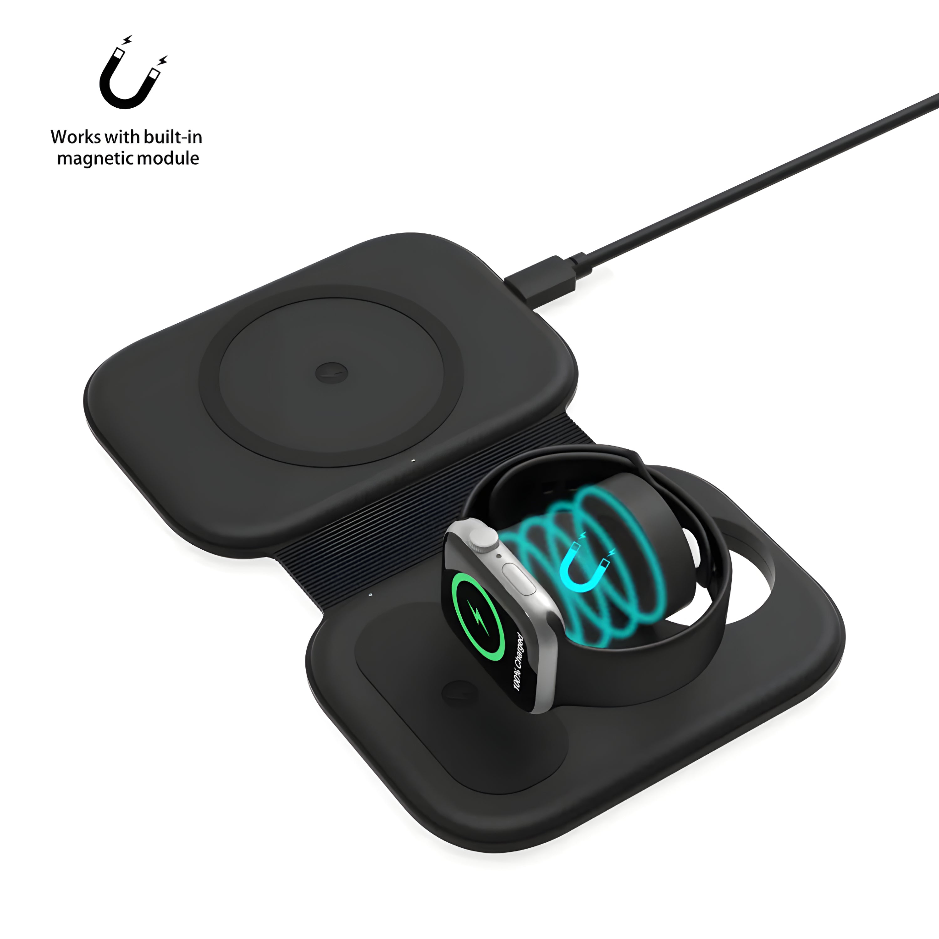 iPhone 12 and newer with MagSafe or magnetic wireless, AirPods with wireless case, and Apple Watch (all series with wireless charging).
